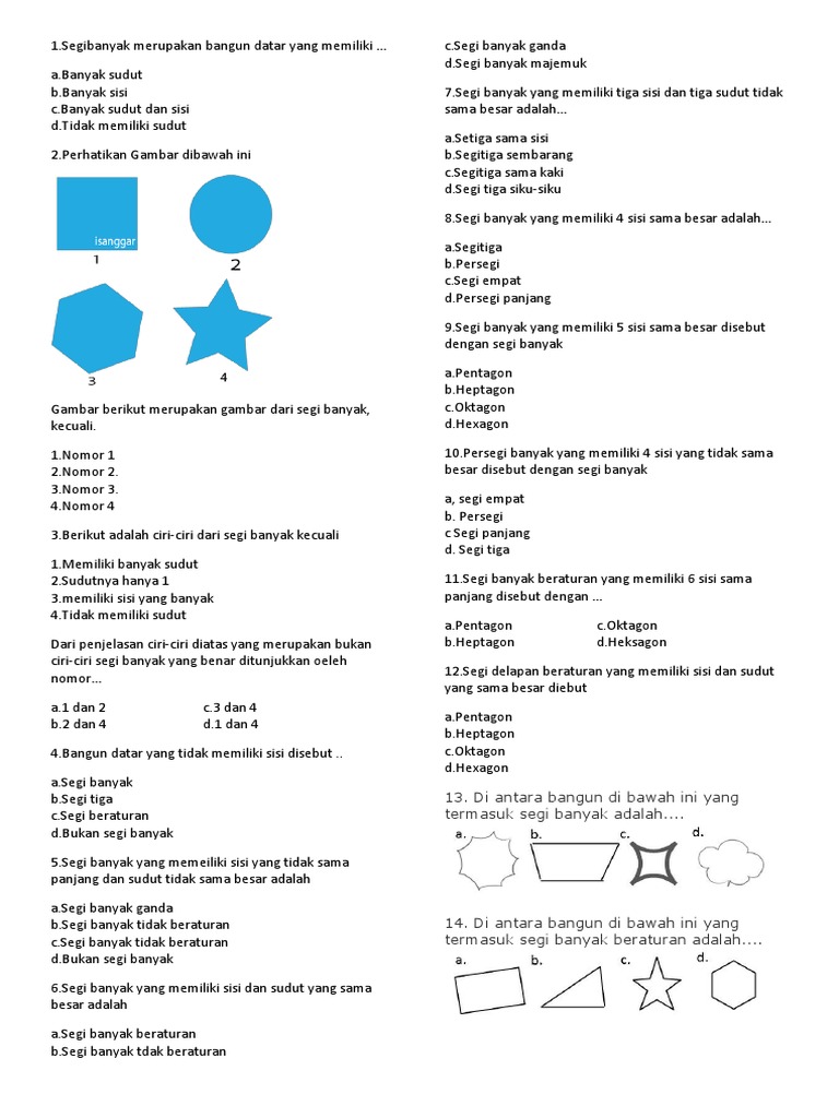 Soal segi banyak. Soal Ulangan Segi Banyak Kelas 4 SD. 20210321 Latihan soal matematika segi banyak kelas 4 sd oleh agus diposting pada januari 16 2020 januari 7 2021 latihan soal mtk segi banyak berikut kami sajikan untuk memudahkan siswa dalam mendalamai materi matematika. Kunci Jawaban 1Segi banyak merupakan bangun datar yang memiliki aBanyak sudut bBanyak sisi cBanyak sudut dan sisi dTidak memiliki sudut 2Perhatikan Gambar dibawah ini.