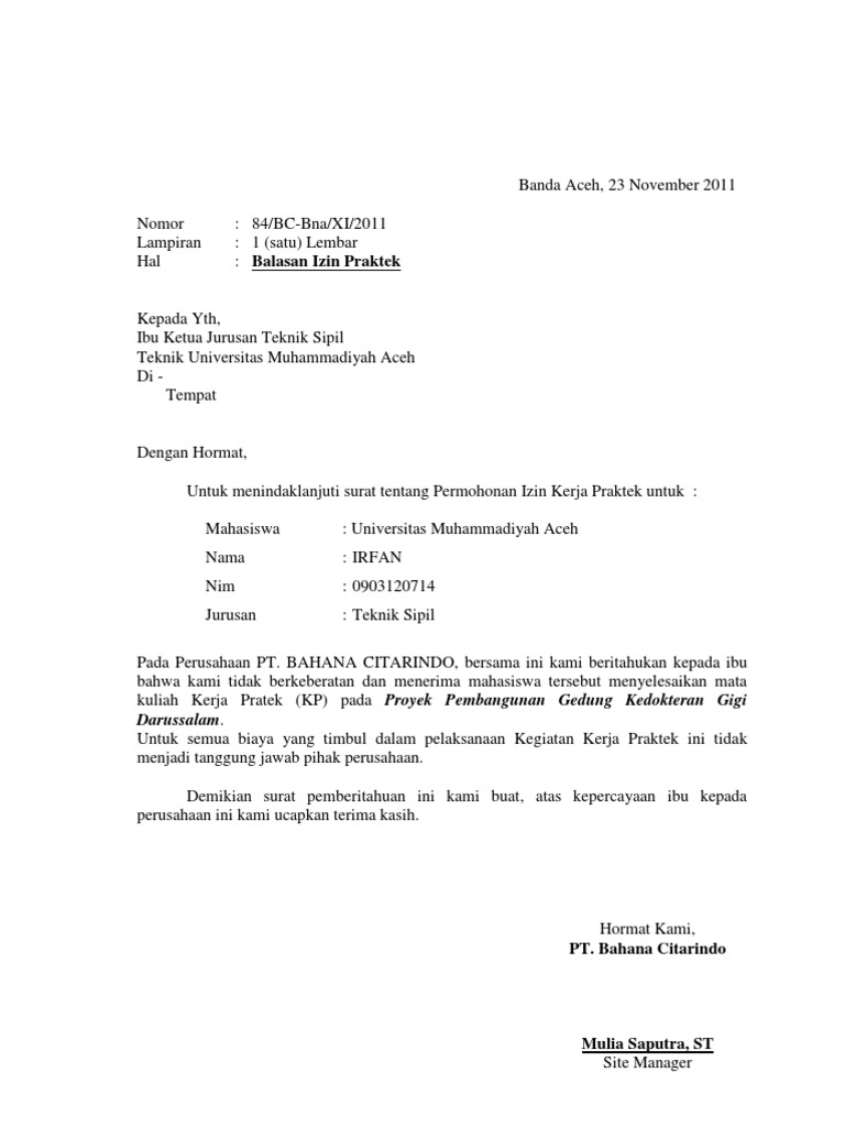 Contoh Surat Balasan Ijin Kerja Praktek Contoh Surat